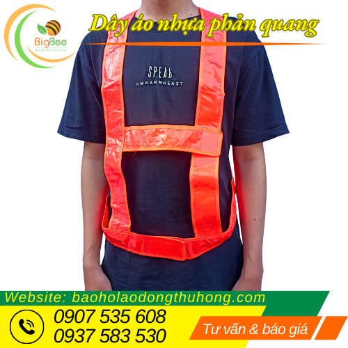 Áo được làm từ dây nhựa dẻo, bền chắc, có khả năng chịu được ma sát và không dễ bị rách trong quá trình làm việc. Thiết kế dạng dây bản lớn ôm gọn cơ thể, không gây vướng víu khi di chuyển. Điểm đặc biệt là phần dải phản quang sáng rõ, giúp phản chiếu ánh sáng tốt khi có đèn xe hay nguồn sáng chiếu vào, nhờ đó người mặc dễ dàng được nhận diện từ xa.